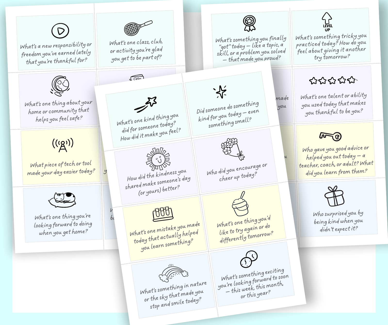 Prompts that guide children to notice specific moments, people, places, or simple comforts they may otherwise overlook.